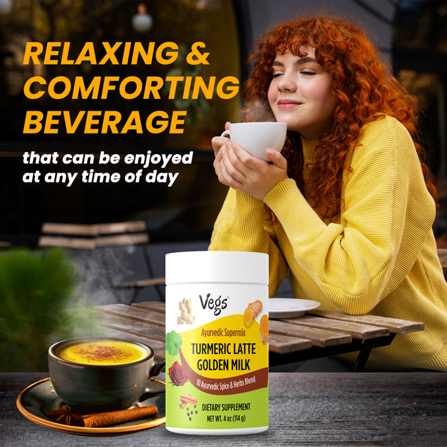 Savor the rich, aromatic wellness of Vegs Ayurvedic Turmeric Latte Golden Milk. This organic golden milk powder is crafted with a traditional Ayurvedic spice blend, including turmeric, black pepper, ginger, cinnamon, and ashwagandha.