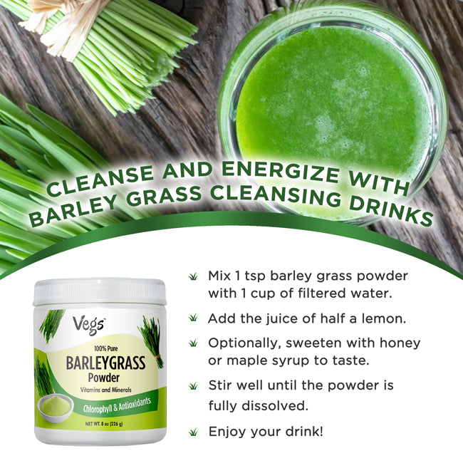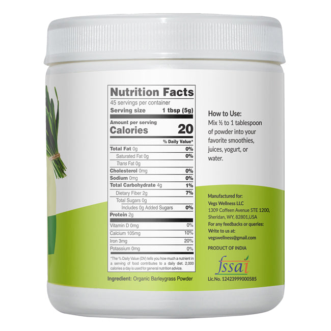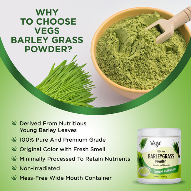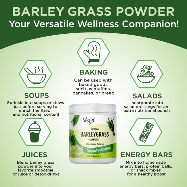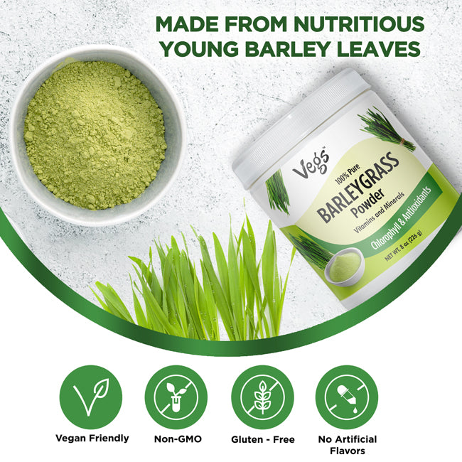 Boost your daily wellness with Vegs Organic Barley Grass Powder, a 100% pure, plant-based superfood. Made from fresh, nutrient-dense barley leaves, this alkalizing green powder supports natural detox, energy, and vitality.