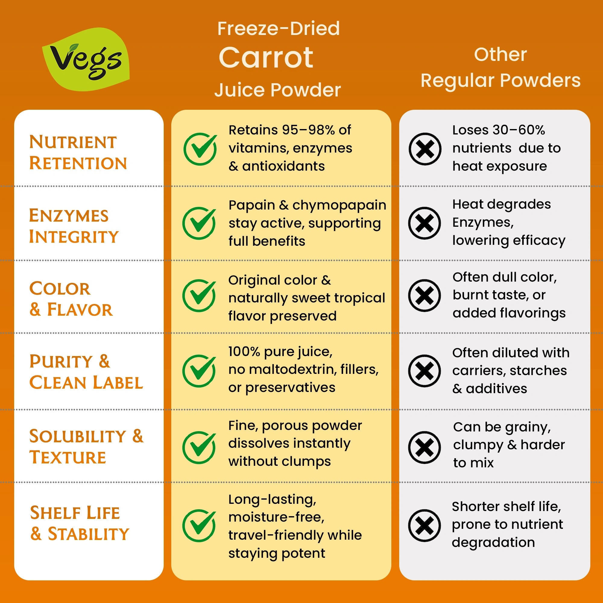 Experience the vibrant nutrition of Vegs Carrot Juice Powder, a premium Organic Carrot Juice Powder made from freeze-dried carrot juice powder using fresh carrots and organic carrots. This high-quality organic carrot juice and carrot juice powder is rich in beta-carotene, antioxidants, and essential nutrients, delivering powerful carrot powder benefits to support natural wellness and vitality. Crafted from real carrot vegetable and carrot, it offers pure, plant-based nutrition in every scoop.