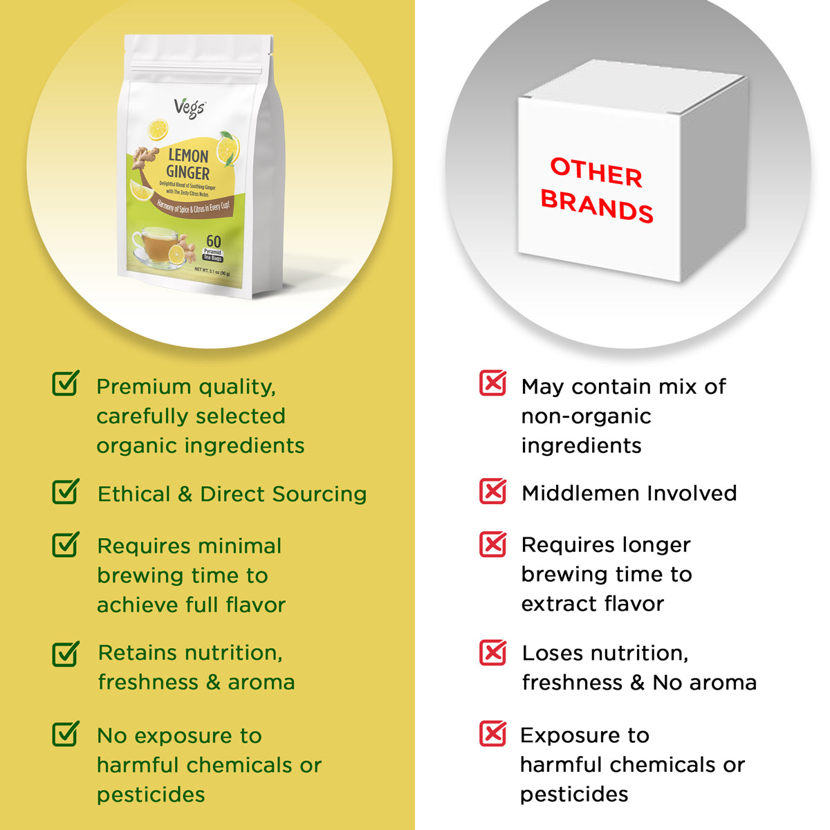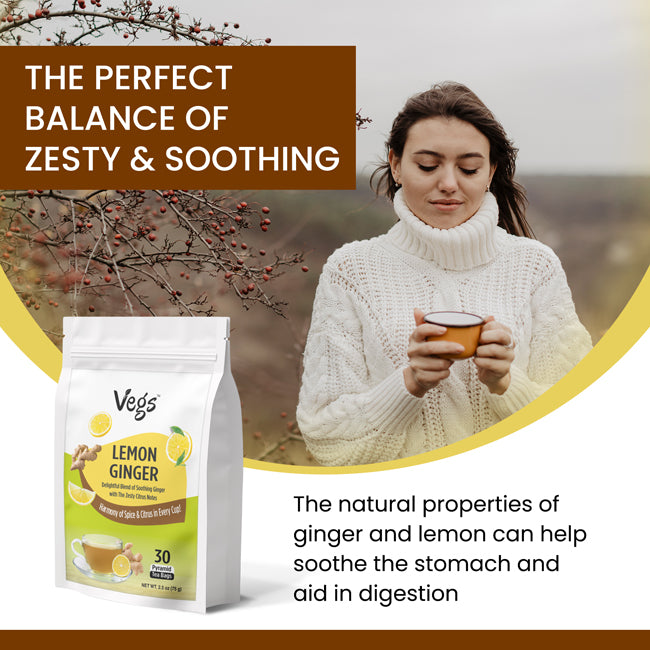 Refresh naturally with Vegs Organic Lemon Ginger Tea Bags, a calming, antioxidant-rich herbal beverage. Made with organic lemon, ginger, and lemongrass, this tea supports daily wellness, digestive health, and natural detox.
