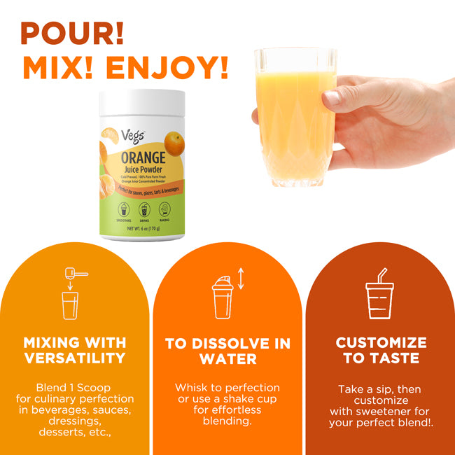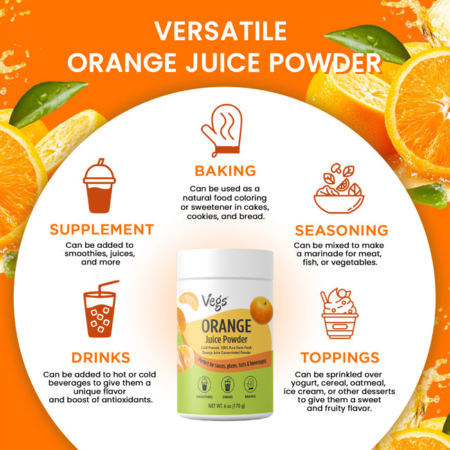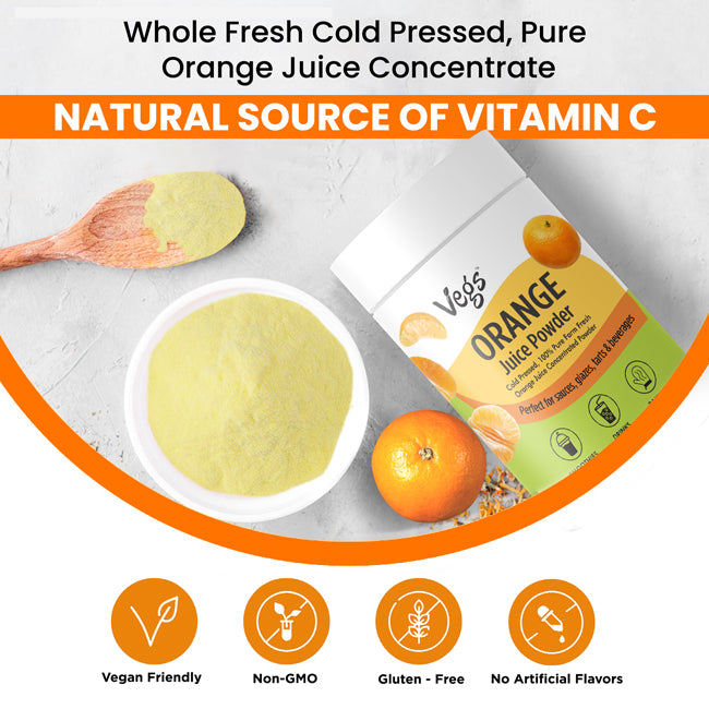 Boost your wellness with Vegs Organic Orange Juice Powder, a 100% freeze-dried, nutrient-dense superfood rich in vitamin C and antioxidants. This vegan superfood powder supports daily energy, immunity, and overall wellness naturally.