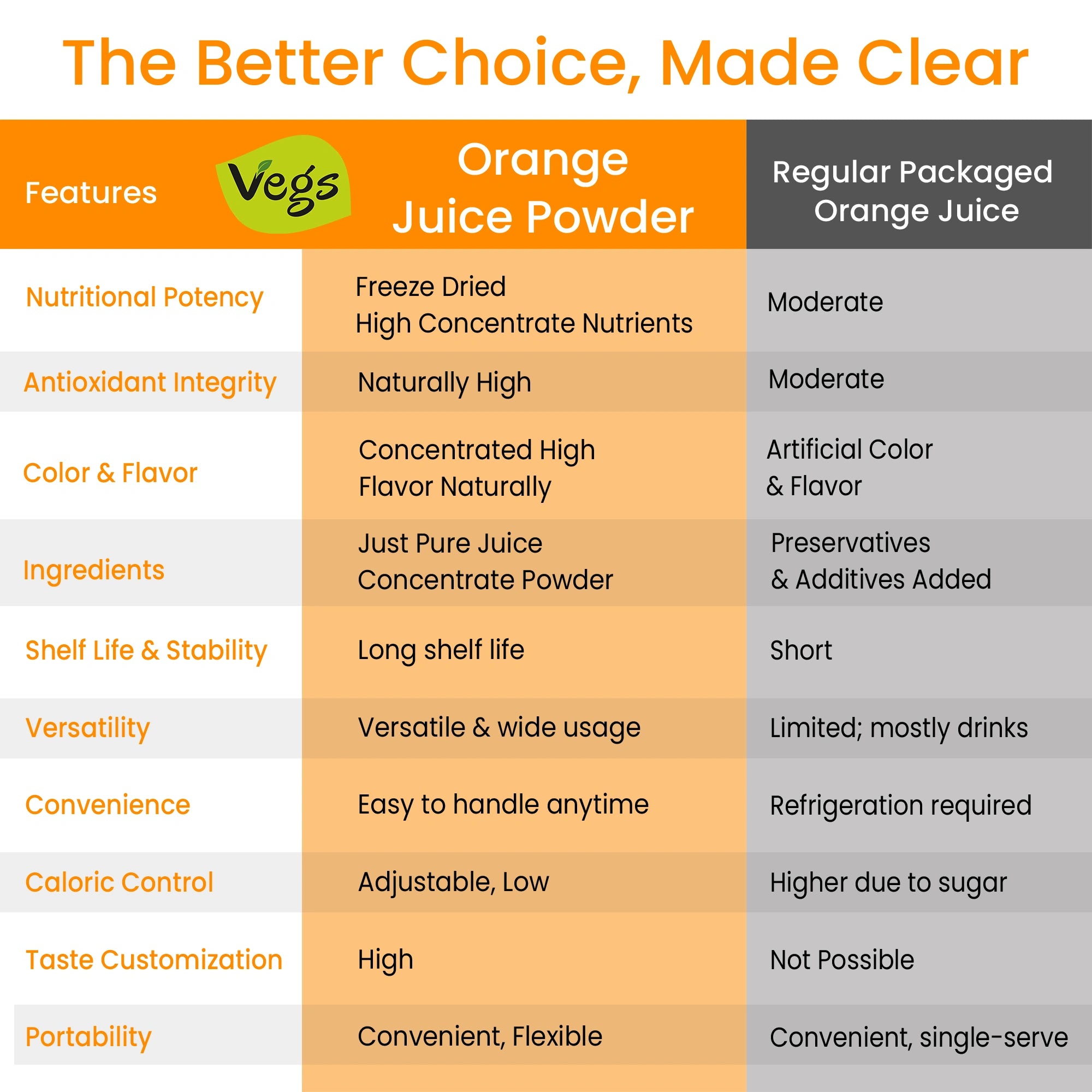 Vegs Orange Juice Powder makes it simple to enjoy real orange flavor—naturally vibrant and versatile for your daily recipes.