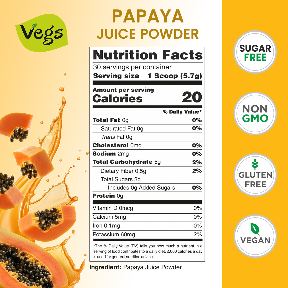 Enjoy the tropical goodness of Vegs Organic Papaya Juice Powder, a 100% freeze-dried fruit powder made from ripe papayas. Packed with vitamins A, C, E, folate, essential minerals, and natural enzymes, this vegan superfood powder is perfect for smoothies, juices, mocktails, desserts, baking, and even DIY skincare.