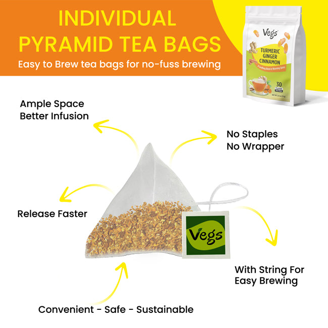 Enjoy the natural warmth of Vegs Organic Turmeric Ginger Cinnamon Tea, a caffeine-free herbal infusion crafted from organic turmeric, ginger, and Ceylon cinnamon. This antioxidant-rich tea supports daily wellness, digestion, detox, and natural energy.