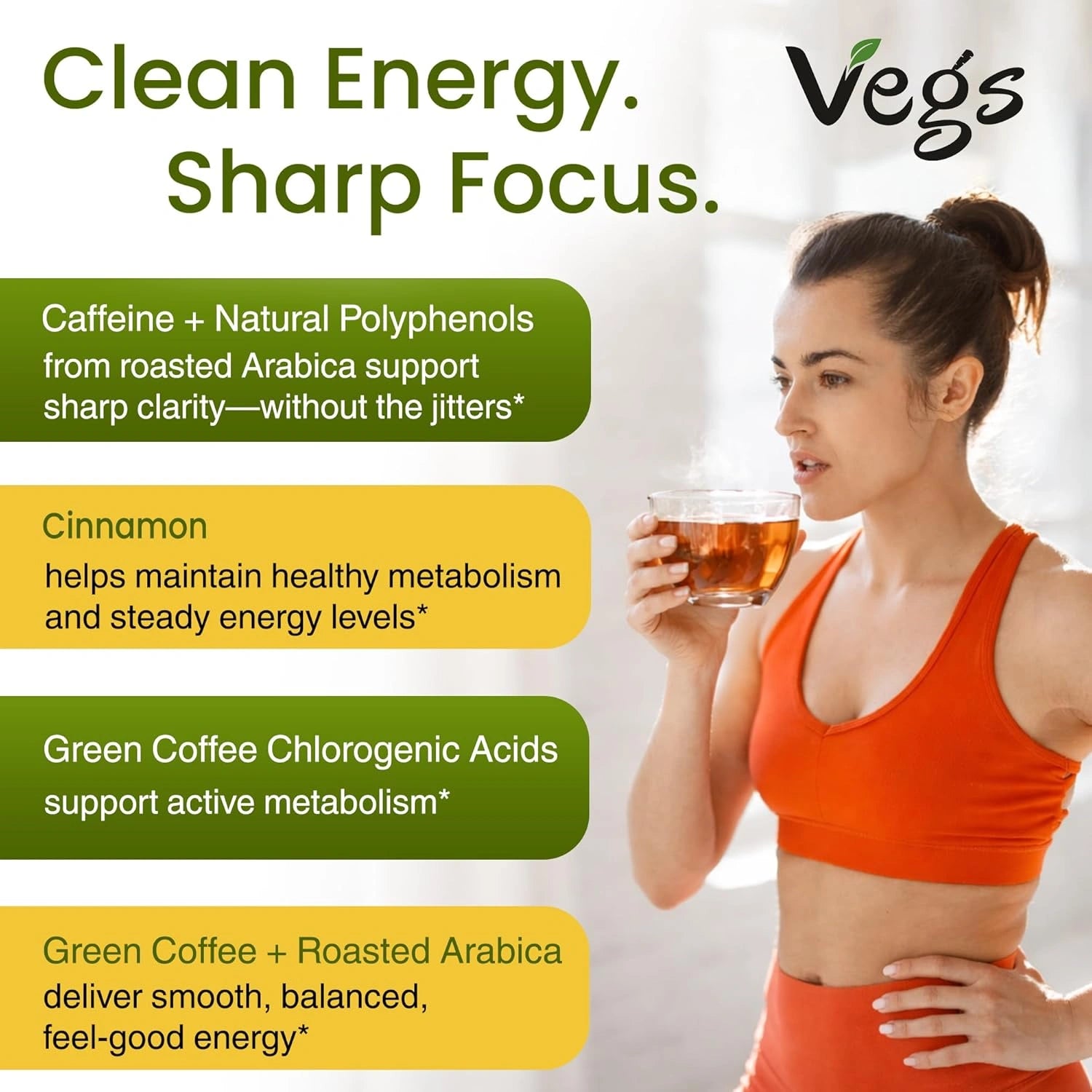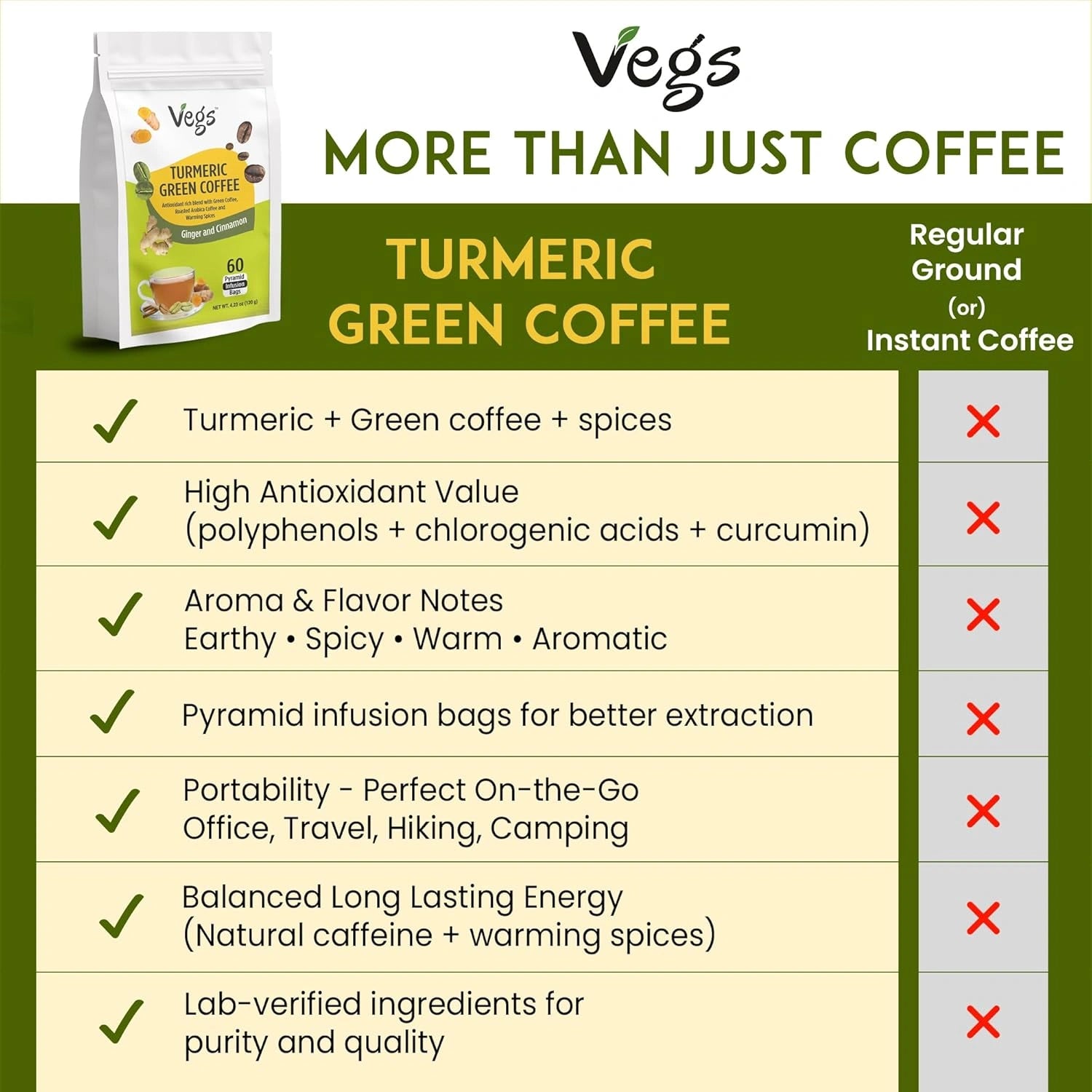 Vegs Organic Turmeric Green Coffee is a plant-based herbal beverage blend made with organic turmeric, green coffee beans, and aromatic spices. This Non-GMO, vegan, and gluten-free drink offers a warm, flavorful alternative to traditional coffee or golden milk.